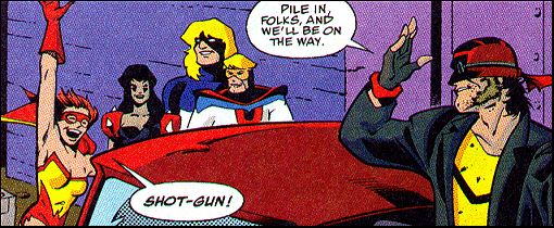 This is it Kids! This is what we've all been waiting for! The forming of the hippest team of young superheros to don capes in the name of masked justice! This is the first issue of Young Heroes In Love! Hard Drive gets everyone together on a rooftop in the big city, then the gang piles into Off-Ramps souped-up roadster Roadshow, the hottest set of wheels since the "Boostermobile", to pick up a mysterious new member! Then they cruise back to their new headquarters, a great big leased warehouse downtown! Can the Young Heroes pack any MORE excitement into their first issue? You bet they can!